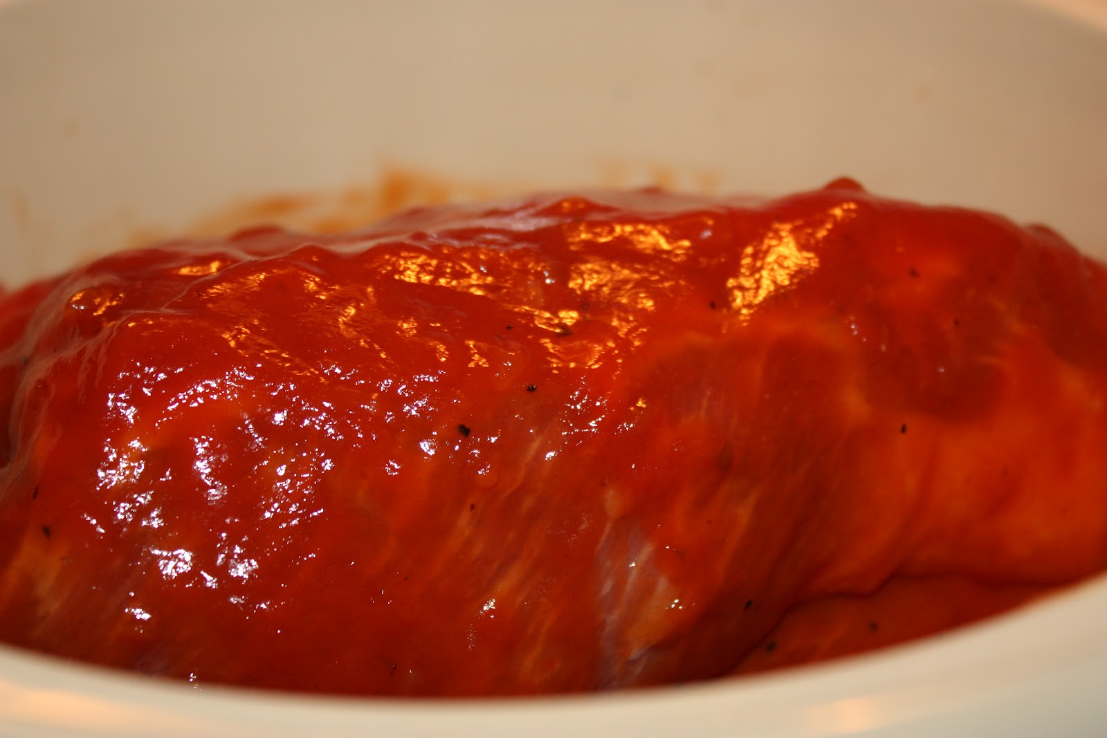 I prepped a pork roast for the crock-pot by smothering it in my homemade BBQ sauce